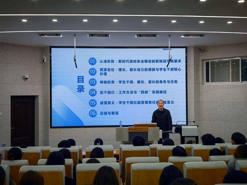 刘明龙详细解读了楼长、层长制度设立的重要意义,强调该制度是完善宿舍管理体系、推动学生“自我管理、自我教育、自我服务、自我监督”的重要抓手。他结合典型案例,讲解了学生干部在实际工作中应掌握的工作方法,进一步明确了学生干部在网格化管理中的角色定位与核心职责,要求大家切实发挥好安全隐患排查员、信息传递宣传员、矛盾纠纷调解员和紧急情况报告员的作用。他强调,学生干部参与安全管理既是职责所在,也是锻炼成长、实现价值的重要途径,希望大家以高度的责任感和务实的作风认真履职,共同筑牢校园安全防线。